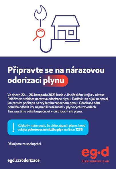 Ve dnech 22. – 26. listopadu 2021 bude v Jihočeském kraji, kromě jiného i v okrese Jindřichův Hradec probíhat nárazová odorizace plynu. Dodávku to nijak neomezí, jen prosím počítejte se zvýšeným zápachem plynu.