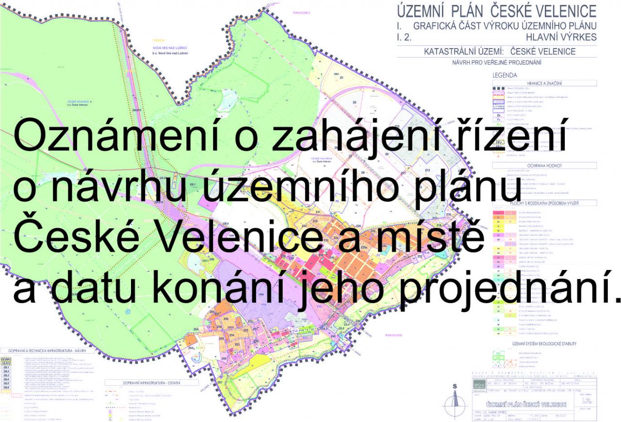 Městský úřad České Velenice, jako pořizovatel územního plánu (dále též jen „ÚP“) České Velenice podle § 6 odst. 2 zákona č. 183/2006 Sb., o územním plánování a stavebním řádu, v platném znění (dále též jen „stavební zákon“), oznamuje dle § 52 odst. 1 stavebního zákona zahájení řízení o návrhu ÚP České Velenice a konání veřejného projednání o upraveném a posouzeném návrhu ÚP České Velenice.