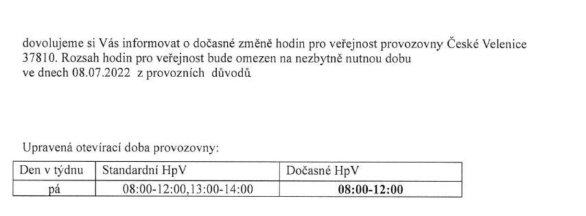 Upravená otevírací doba provozovny pošty Č. Velenice dne 8. 7. 2022 1