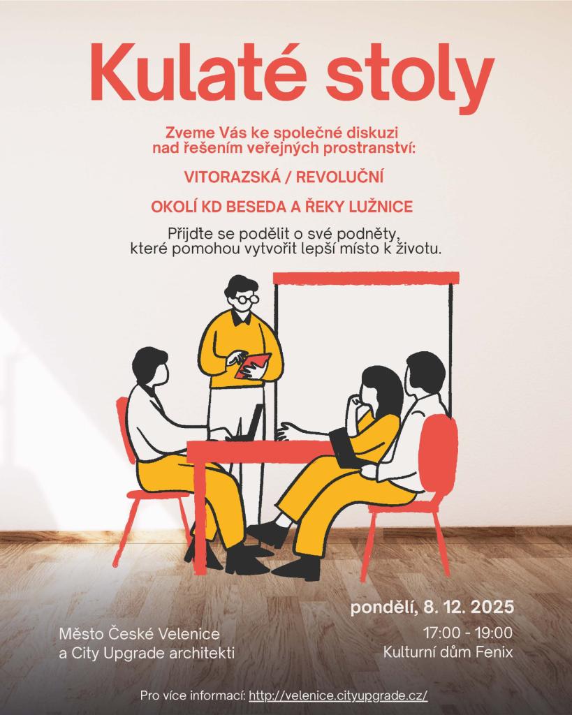 Zveme všechny místní, aby přišli sdílet své zkušenosti, podněty a přání k řešení veřejných prostranství v Českých Velenicích na setkání s architekty ze studia CityUpgrade, kteří pro město zpracovávají studie pro oblast ulice Vitorazské a kolem Kulturního domu Beseda. Setkání se bude konat v pondělí 8. prosince od 17:00 v Česko-rakouském centru Fenix. Těšíme se na Vás!!
