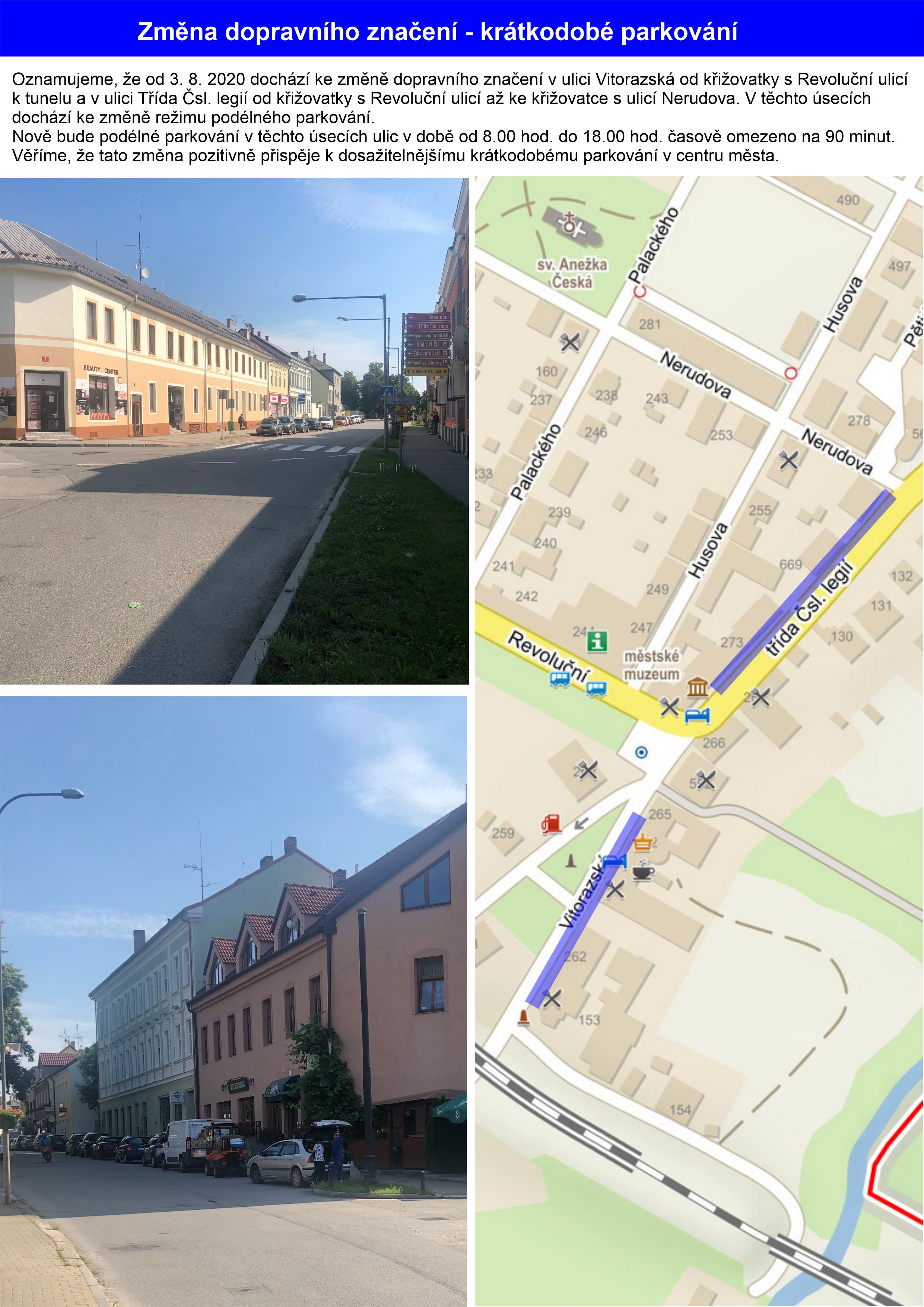Oznamujeme, že od 3. 8. 2020 dochází ke změně dopravního značení v ulici Vitorazská od křižovatky s Revoluční ulicí k tunelu a v ulici Třída Čsl. legií od křižovatky s Revoluční ulicí až ke křižovatce s ulicí Nerudova. V těchto úsecích dochází ke změně režimu podélného parkování. Nově bude podélné parkování v těchto úsecích ulic v době od 8.00 hod. do 18.00 hod. časově omezeno na 90 minut.