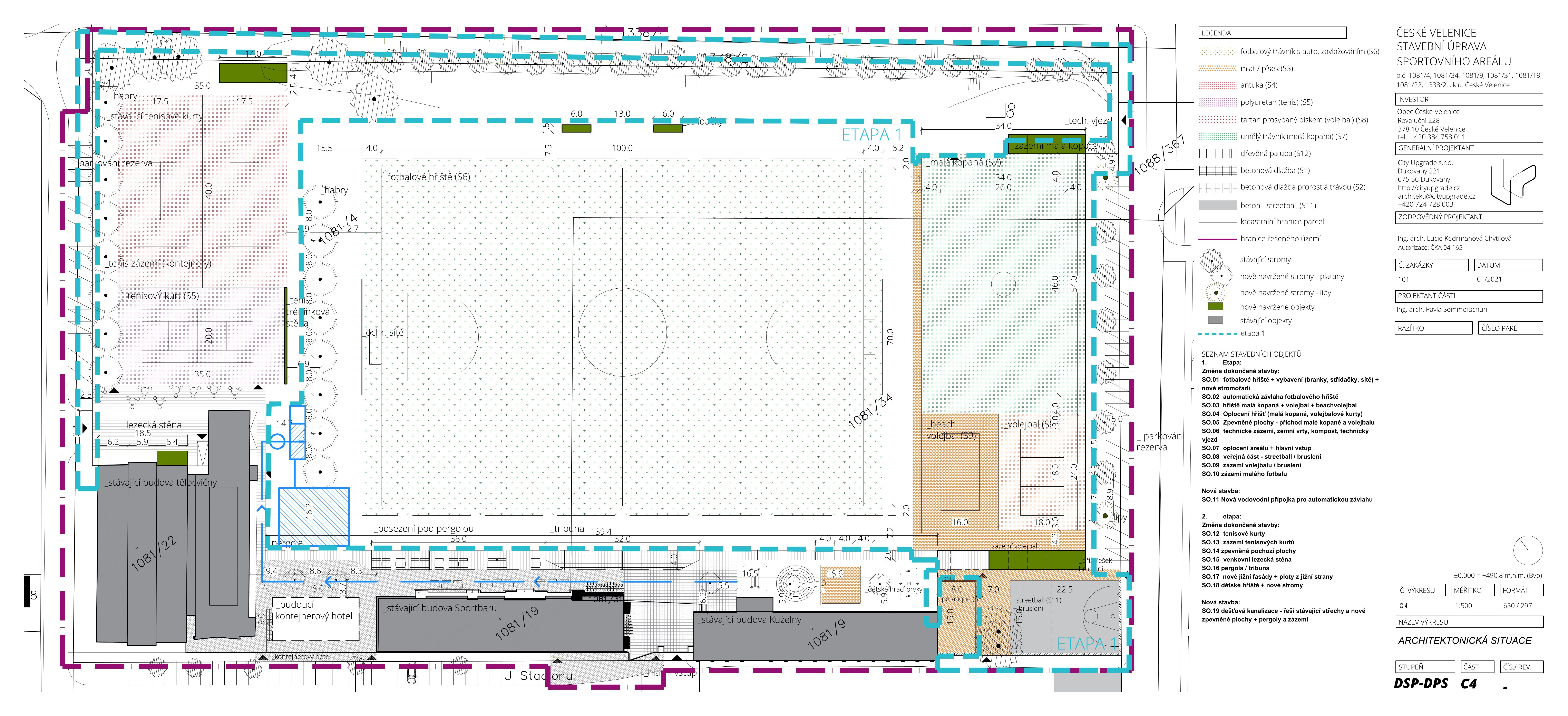 Projekt počítá s úplně novým fotbalovým hřištěm s automatickou závlahou. To se posune blíže k současným tenisovým kurtům a na nově zvětšené ploše směrem k Havlíčkově ulici budou nově vybudovány kurty na volejbal a beachvolejbal. Součástí projektu je také nové hřiště s umělým trávníkem a umělým osvětlením. Pro umělou závlahu fotbalového hřiště, údržbu sportovišť a pro užitkovou vodu bude využito nádrží, které budou v areálu nově vybudovány, a do kterých bude svedena voda ze střech budov v areálu. Pro dodávku potřebného množství vody bude zároveň využit vrt, který město v areálu pořídilo v minulém roce. Jak potvrdily čerpací zkoušky, vrt má dostatečnou vydatnost, aby zajistil dostatek vody nejen na zalévání sportovišť, ale i pro využití vody jako užitkové v objektech areálu.