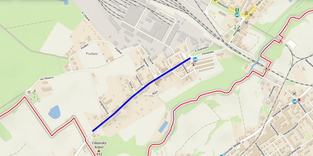 Z této části města máme neustále stížnosti na kvalitu pitné vody. Současný řad je z litiny bez povrchové úpravy s netěsnými hrdly. Vyměněno bude potrubí v úseku od hraničního přechodu na Wielands po křižovatku u pekáren. Předpokládané náklady této akce jsou 10 mil. Kč. O termínu zahájení prací budeme v předstihu informovat.