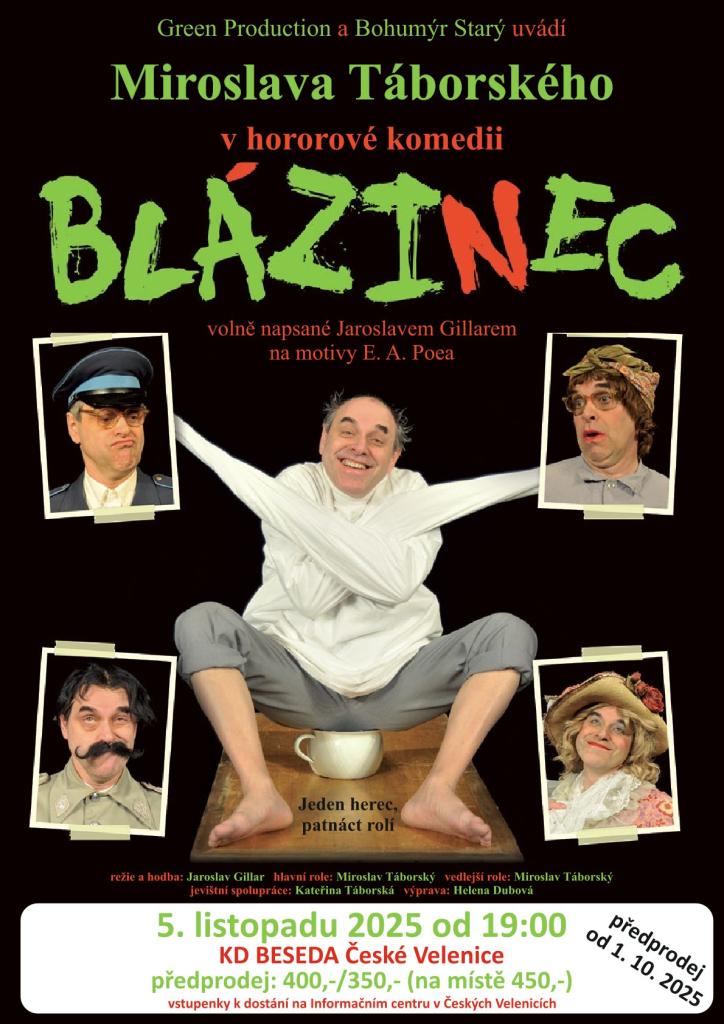 Hra BLÁZINEC Jaroslava Gillara je napínavou groteskou o světě, ve kterém se vlády zmocní blázni z jednoho psychiatrického ústavu. Téma ovládnutí společnosti šílencem je stále aktuální. Nečekané zvraty a konflikty jsou doprovázeny crazy sitruacemi jako z němého filmu. Výstupy často připomínají dramatiku absurdního divadla. Hra je inspirována mimo jiné motivy E.A.Poea, sugestivní scény strachu a hrůzy jsou protkány typickým Poeovským humorem a vytvářejí tak pro diváka velký jevištní zážitek.