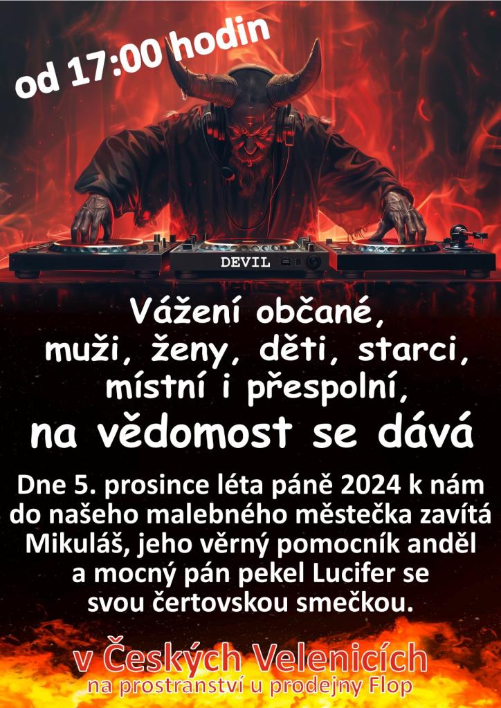 Dne 5. prosince léta páně 2024 k nám do našeho malebného městečka zavítá svatý Mikuláš, jeho věrný pomocník anděl a mocný pán pekel Lucifer se svou čertovskou smečkou.